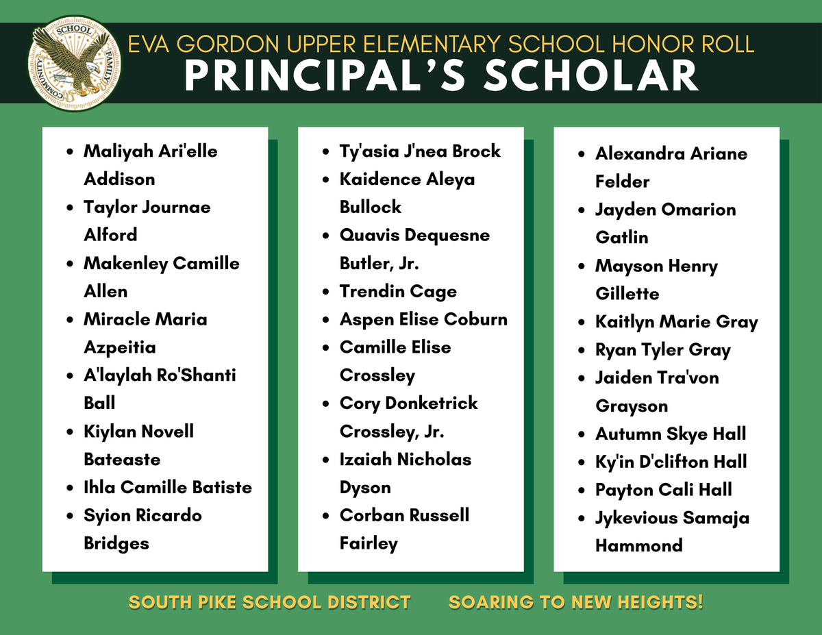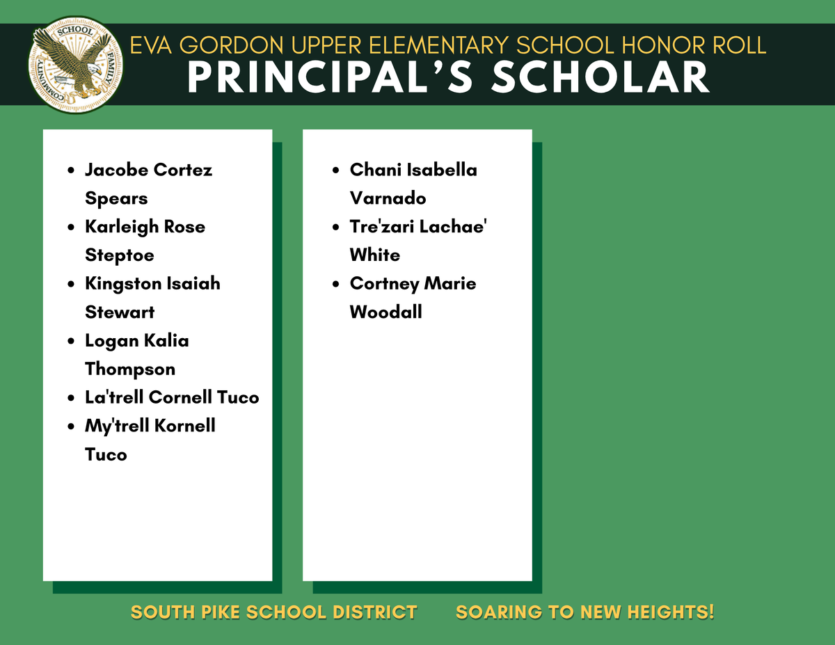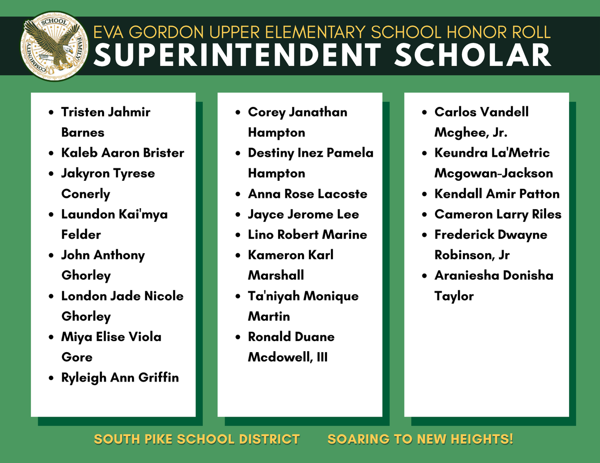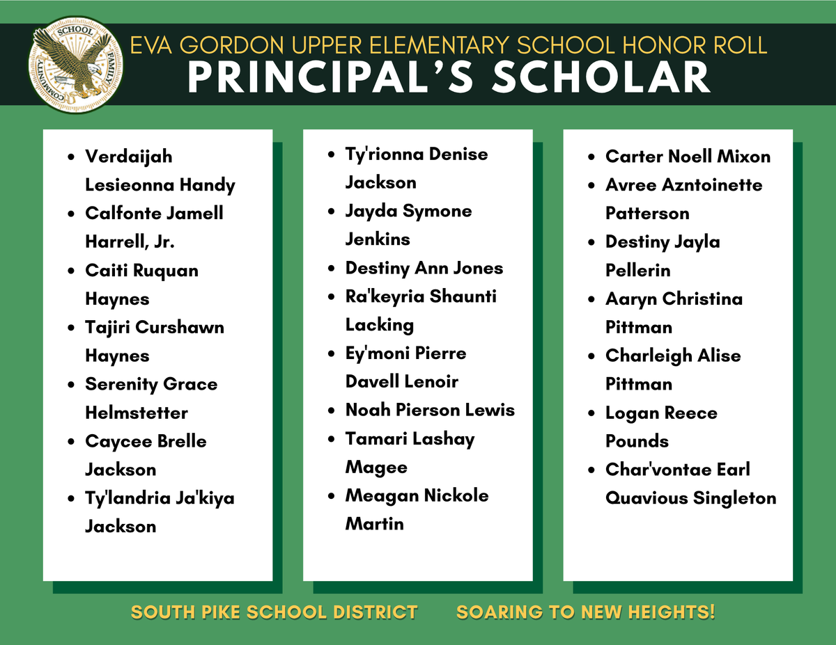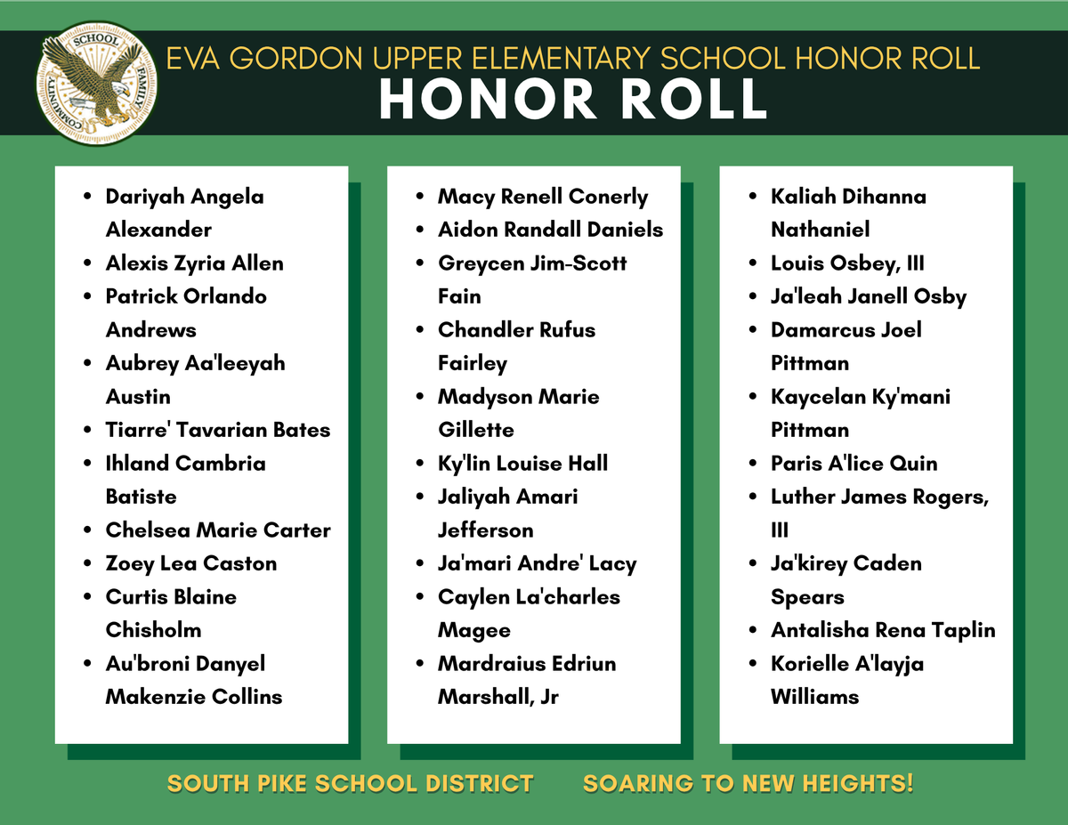 We are thrilled to share the accomplishments of our Honor Roll Eagles at Eva Gordon Upper Elementary School! 🎓📚 For the first nine weeks, these outstanding students have demonstrated dedication and excellence in their studies. Let's give them a big round of applause for their hard work and commitment. Congratulations to all! Keep up the fantastic work, and continue to soar high! 🦅✨