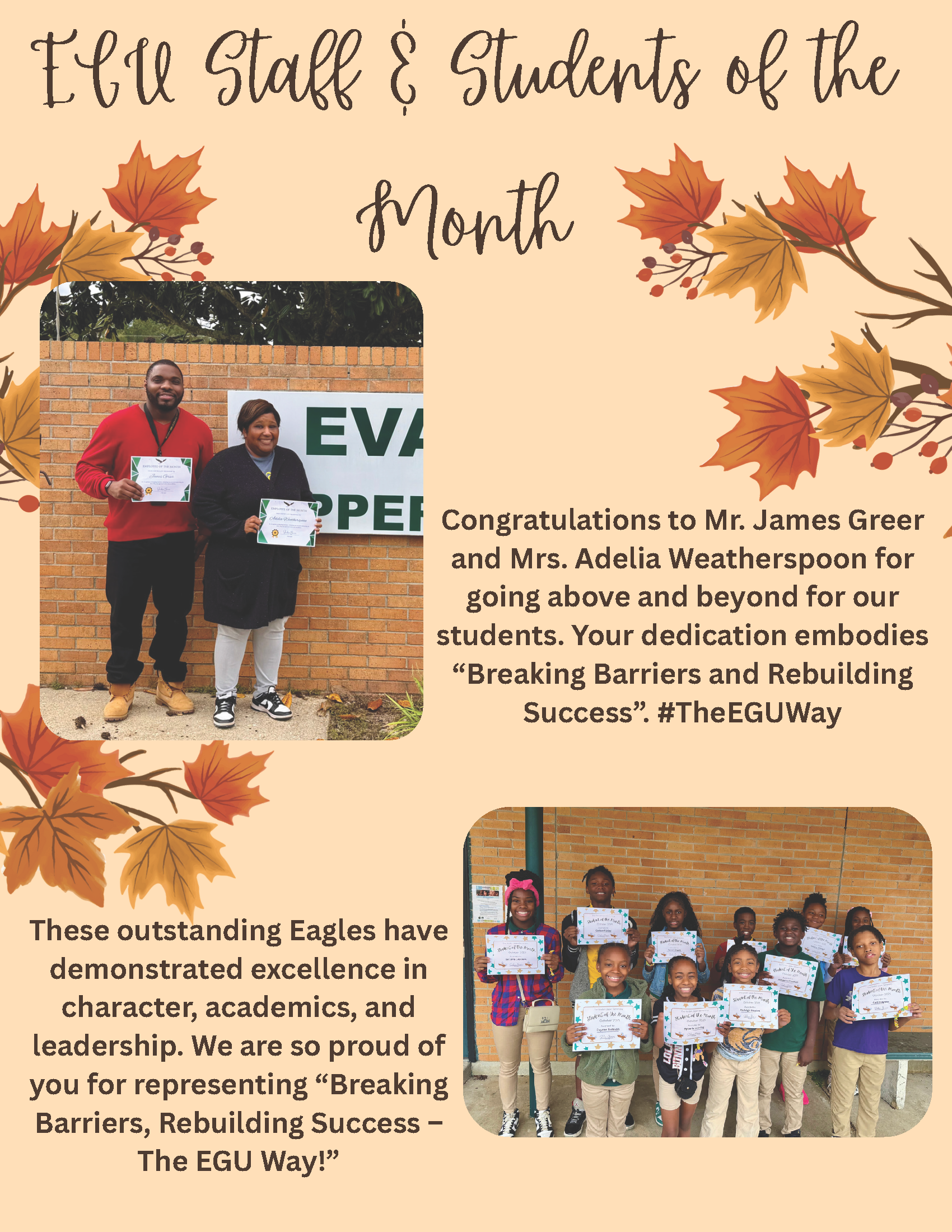 Congratulations to Mrs. Adelia Weatherspoon and Mr. James Greer for going above and beyond for our Eagles. Your dedication embodies βBreaking Barriers, Rebuilding Success β The EGU Way!β