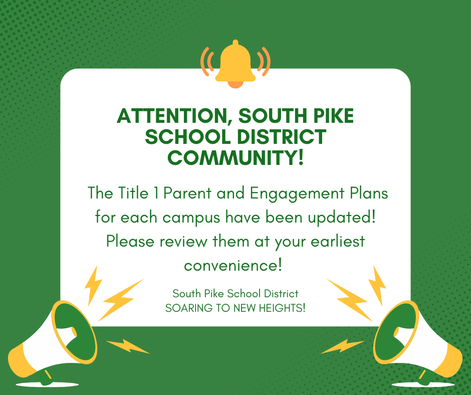 📢 Attention, South Pike School District Community! We're excited to announce that the Title 1 Parent and Engagement Plans for each campus have been updated. We encourage you to review them at your earliest convenience. Let’s continue soaring to new heights together! 🚀 #SouthPikeSchools #CommunityEngagement