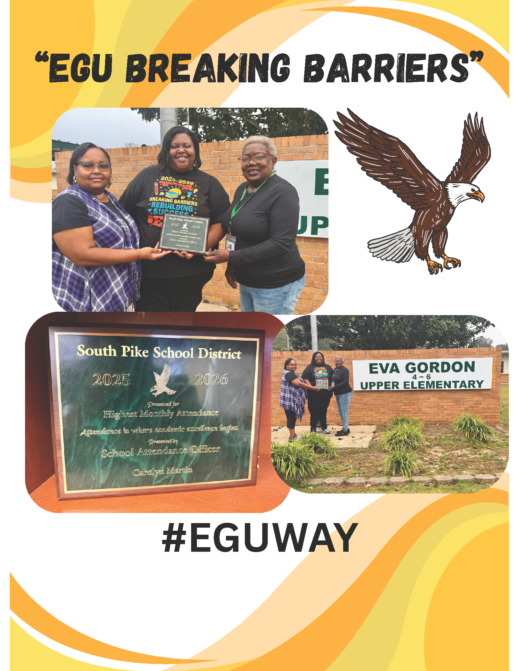 We are excited to share that Eva Gordon Upper Elementary has earned the Highest Monthly Attendance Plaque for the month of October, leading the district with an impressive 95.5% ADA!
