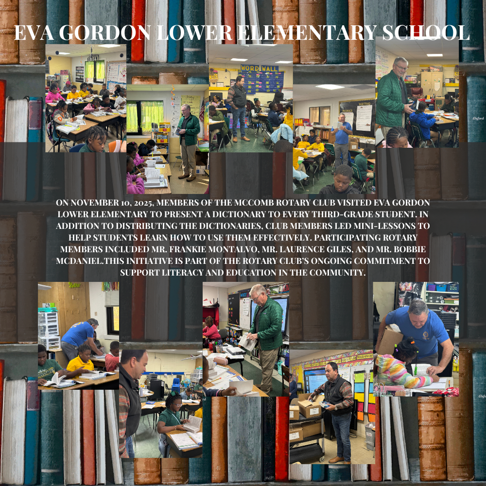 Exciting day at Eva Gordon Lower Elementary! On November 10, 2025, the McComb Rotary Club visited our school to present each third-grade student with their very own dictionary. Club members, including Mr. Frankie Montalvo, Mr. Laurence Giles, and Mr. Bobbie McDaniel, also conducted mini-lessons to help our students learn how to use them effectively. This generous initiative is part of the Rotary Club's ongoing commitment to promoting literacy and education in our community. We are grateful for their support in enhancing our students' learning experience! 📚🎉 #RotaryClub #LiteracyMatters #CommunitySupport