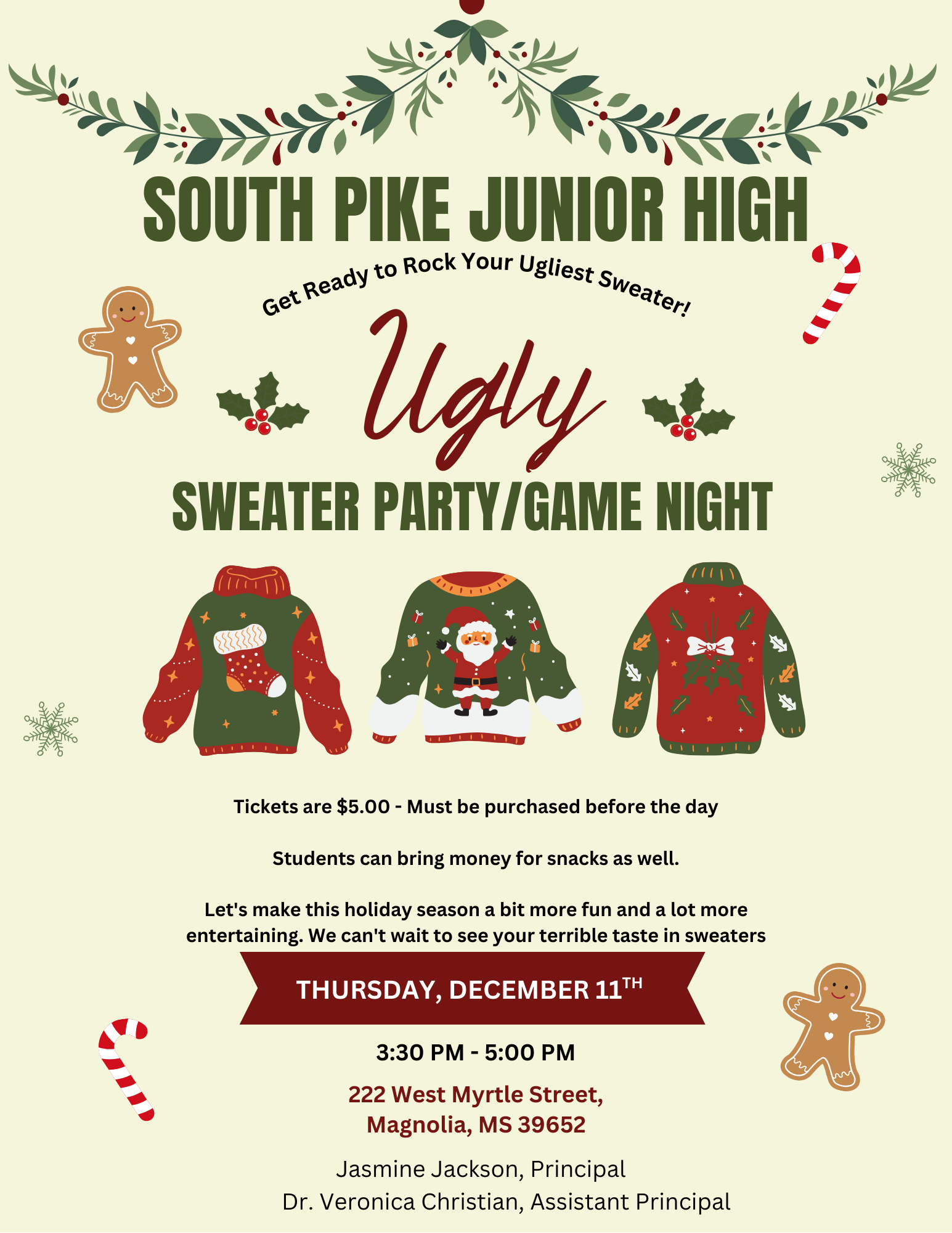 π South Pike Junior High invites you to our Ugly Sweater Party & Game Night! π² Come show off your wonderfully awful sweaters on Thursday, December 11th, from 3:30 to 5:00 PM. Tickets are only $5 and must be purchased in advance. Donβt forget to bring some cash for tasty snacks! Weβre excited to have a great time with you at 222 West Myrtle Street, Magnolia, MS 39652. Letβs make this holiday season unforgettable! Hosted by Principal Jasmine Jackson and Dr. Veronica Christian, Assistant Principal. ππ