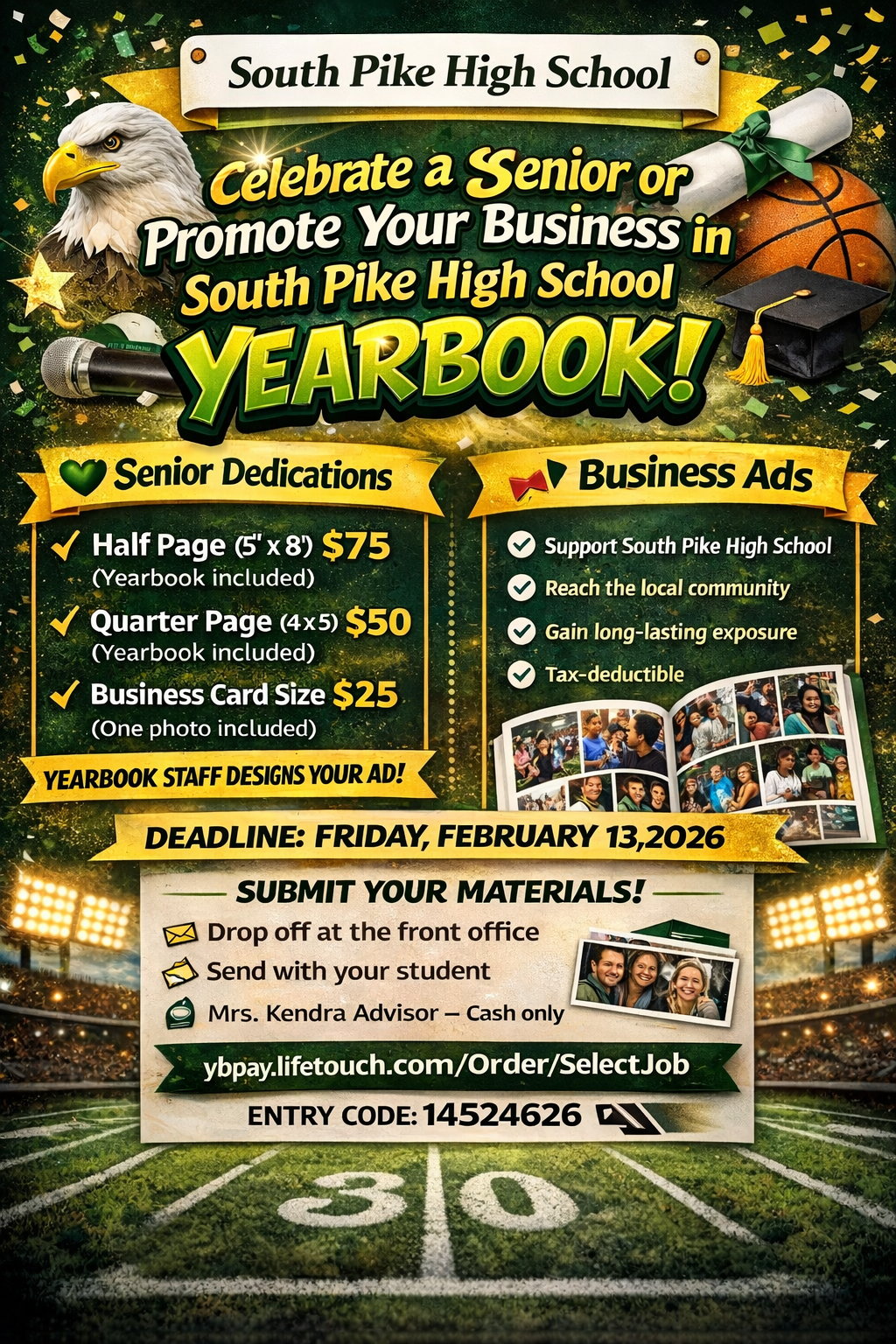 π Capture the memories of South Pike High School with our exclusive yearbook! Order yours for just $41 at https://ybpay.lifetouch.com/Order/SelectJob using school code 14524626. Last day to order is April 1, 2026. Celebrate your senior with a dedication ad, or promote your business to our community. Ads range from $25 to $75, some including a yearbook. Submit your message and photos by February 13, 2026, and our staff will design your ad! For business ads, contact Mrs. Kendra Fortenberry at 601-783-0420 or [email protected]. Donβt miss out! π