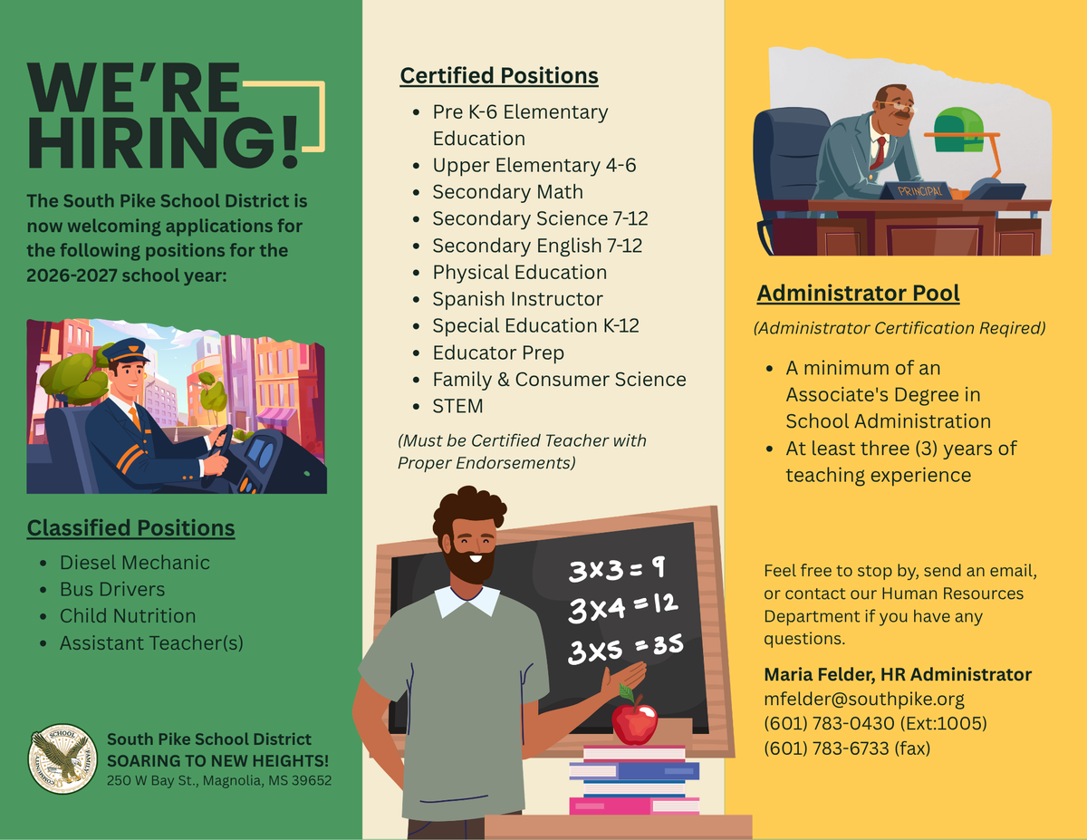 π Exciting news! The South Pike School District is now accepting applications for a variety of positions for the 2026-2027 school year. Weβre on the lookout for passionate educators, skilled administrators, and dedicated support staff to join our team. Whether you're a certified teacher, an experienced administrator, or someone with a knack for support roles, we have something for you!