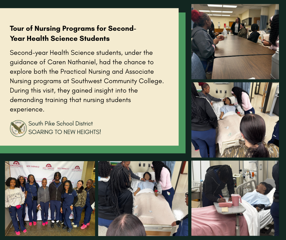 Exciting news! Second-year Health Science students from the South Pike School District had a unique opportunity to visit Southwest Community College. Under the guidance of Caren Nathaniel, they explored the Practical Nursing and Associate Nursing programs. This visit provided them with a firsthand look at the rigorous training nursing students undertake. We are thrilled to support our students as they soar to new heights in their educational journey! #SoaringToNewHeights #NursingEducation